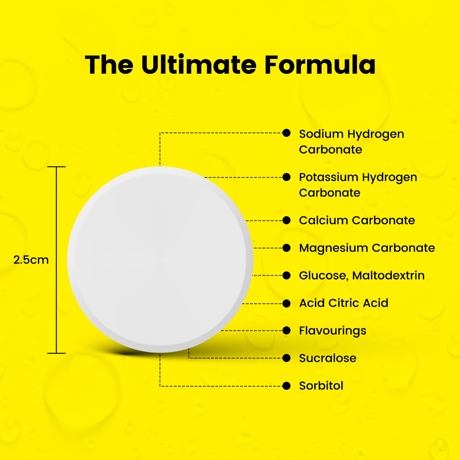 Glucosa, Ácido Cítrico, Bicarbonato de Sodio, Bicarbonato de Potasio, Carbonato de Calcio, Aromatizantes, Carbonato de Magnesio, Endulzante Sucralosa, Maltodextrina, Agente de Volumen Sorbitol.